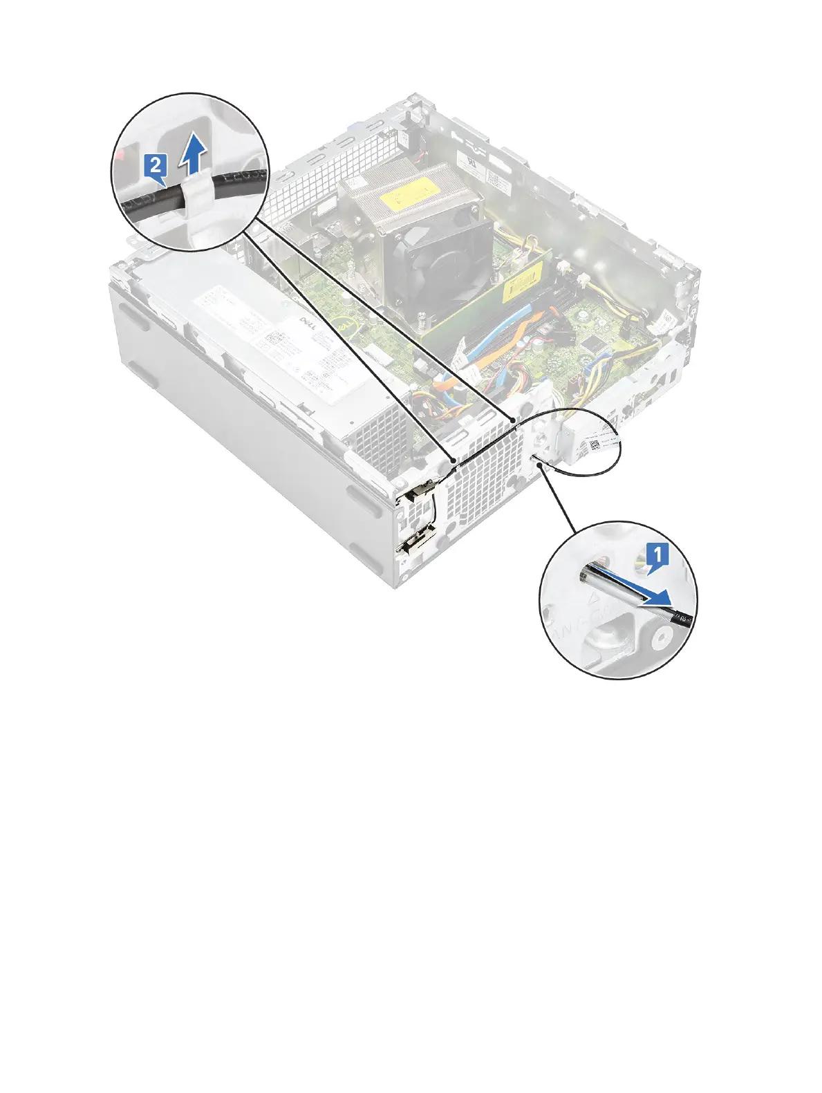 b Unroute the antenna cable from the two hooks on the chassis [2].
