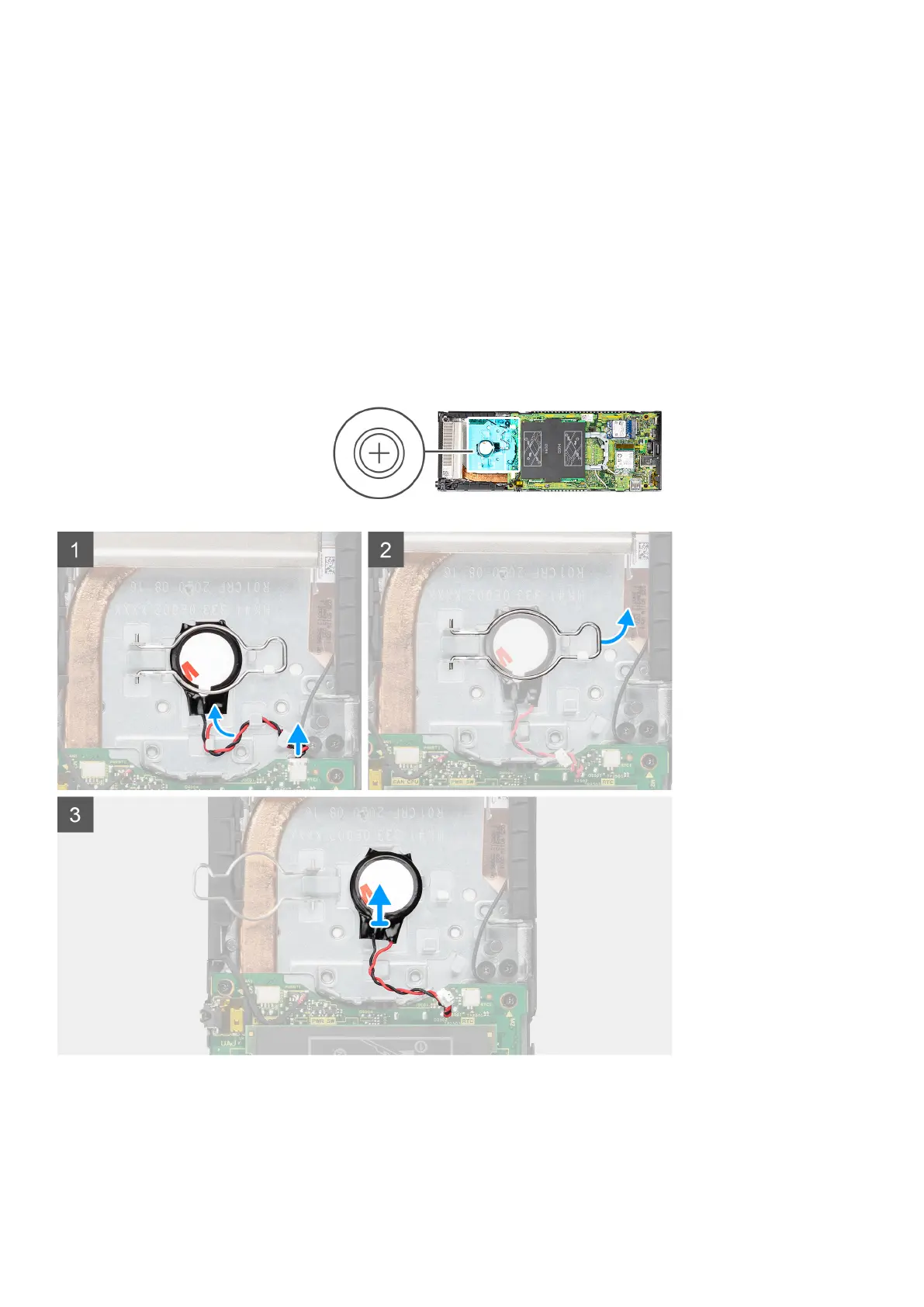 The figure indicates the location of the coin-cell battery and provides a visual representation of the removal procedure.