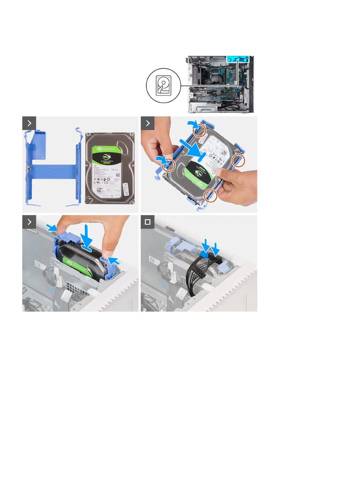cage as illustrated. Push the hard-drive assembly into the hard-drive cage until it locks into place.