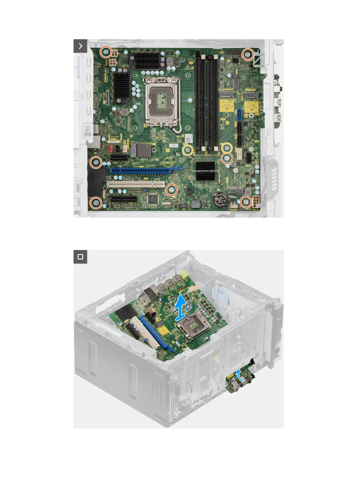 7. Lift the system board at an angle and remove the system board from the chassis.
