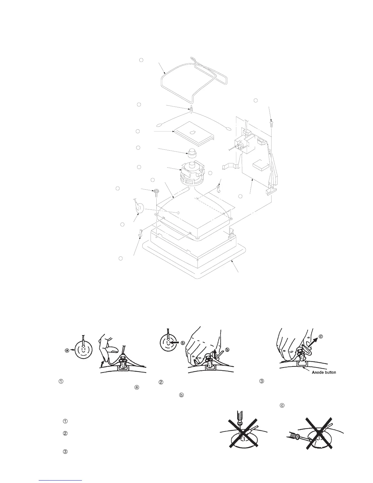 NOTE: Short circuit the anode of the picture tube and the anode cap to the metal chassis, CRT shield or carbon painted on the CRT, after