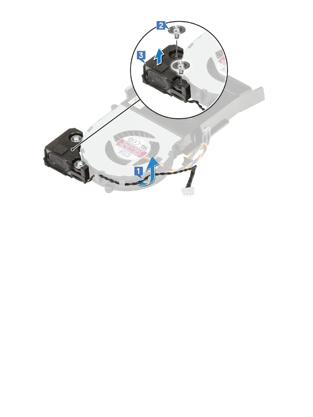 c Route the speaker cable through the retention hooks on the heat sink blower [3].