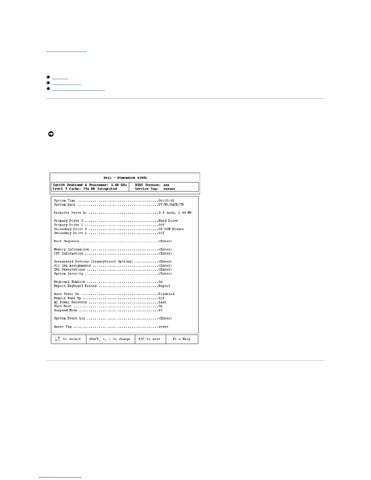 The system setup program screens display the current configuration information for your computer. Information on the screen is divided into five areas: