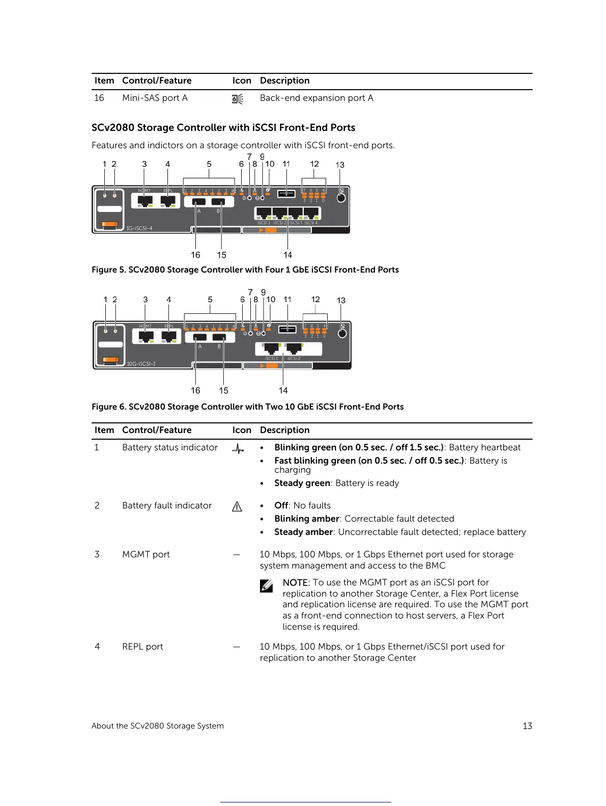 Features and indictors on a storage controller with iSCSI front-end ports.