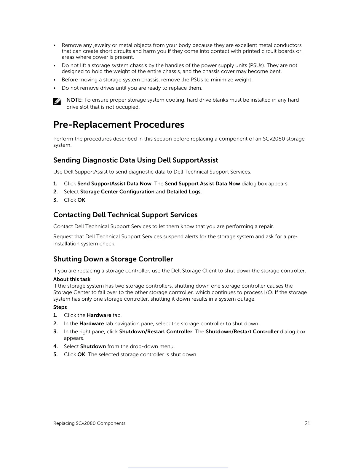 Perform the procedures described in this section before replacing a component of an SCv2080 storage