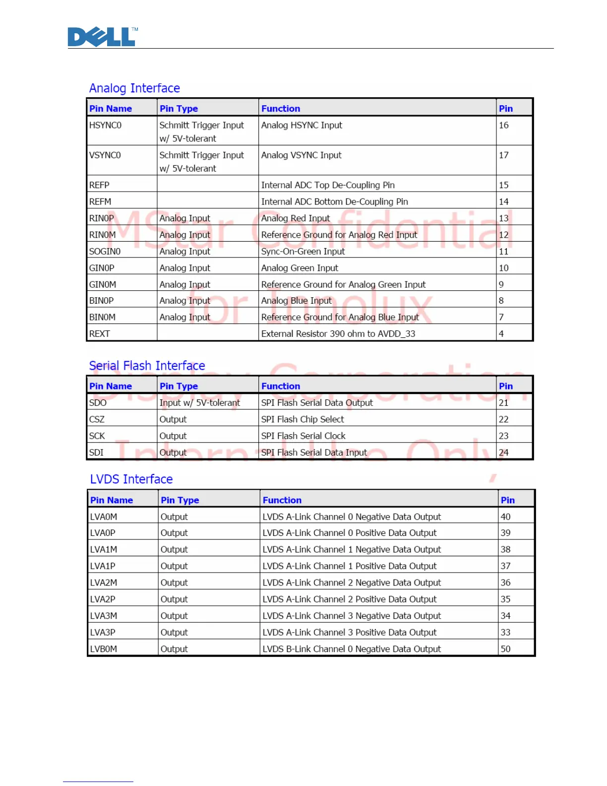Dell E1709W - 8. Key Parts Pin Assignments; U105 (TSUM1 PER-LF-2) Analog Interface; U105 (TSUM1 PER-LF-2) Serial Flash Interface; U105 (TSUM1 PER-LF-2) LVDS Interface