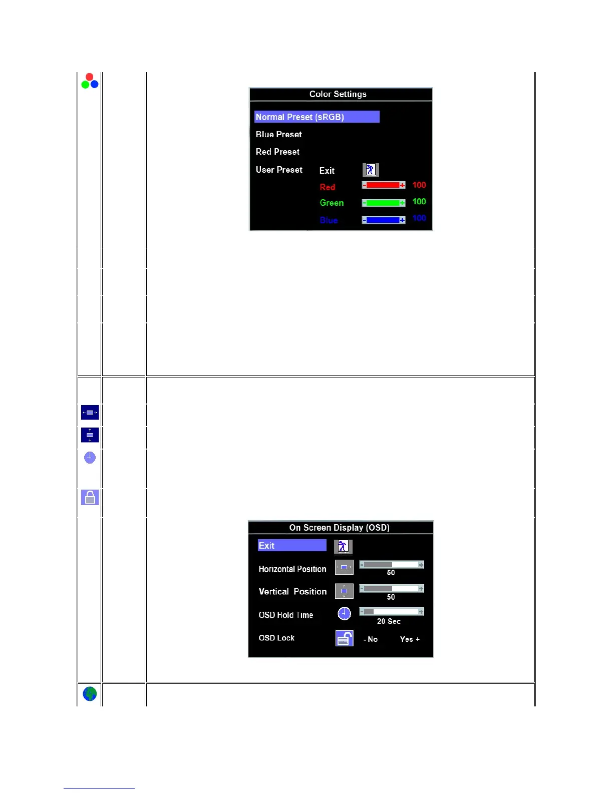 Each time the OSD opens, it displays in the same location on the screen. 'OSD Settings' (horizontal/vertical) provides control over this