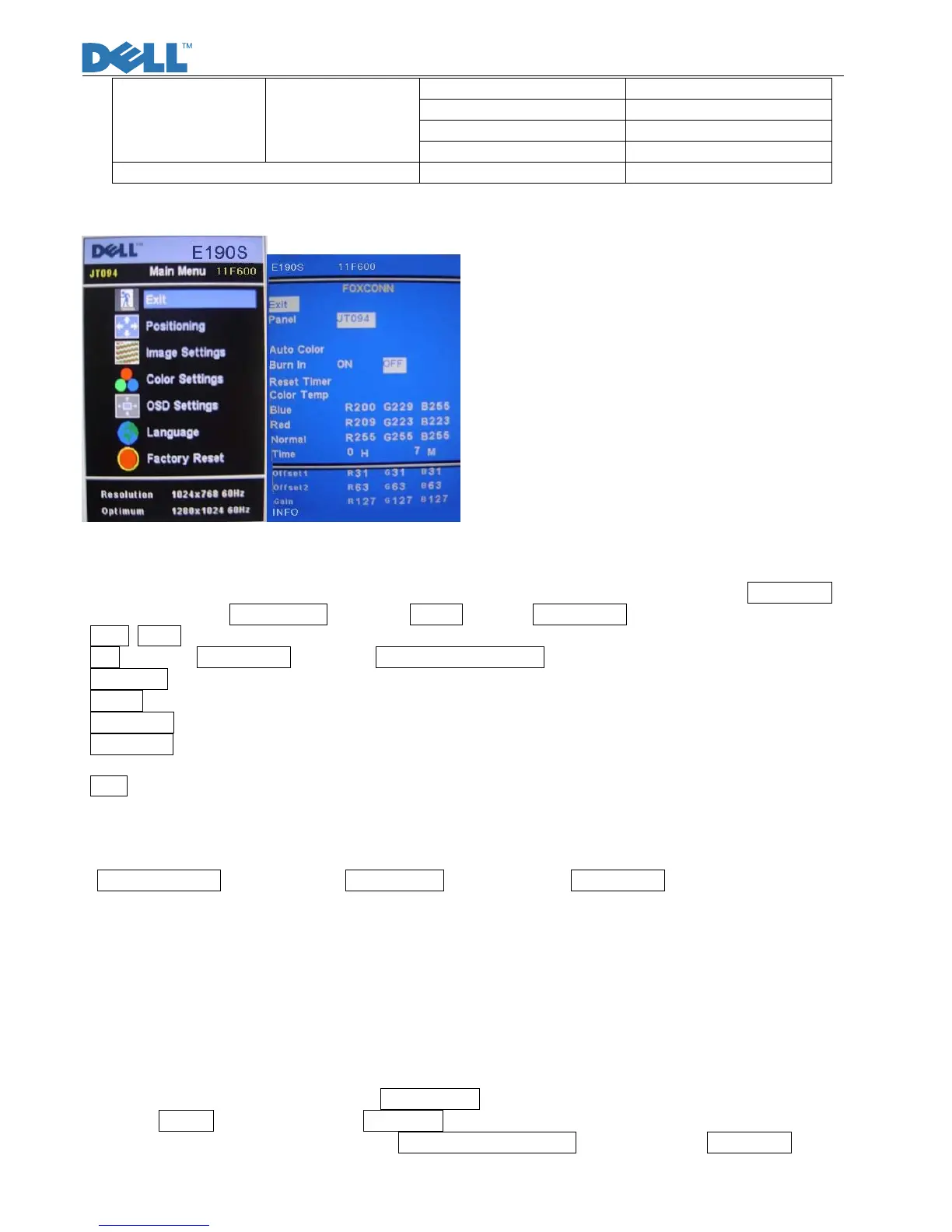 Burn-in pattern will not be stopped until plugging in the VGA cable. Then, press “Menu” button to call out