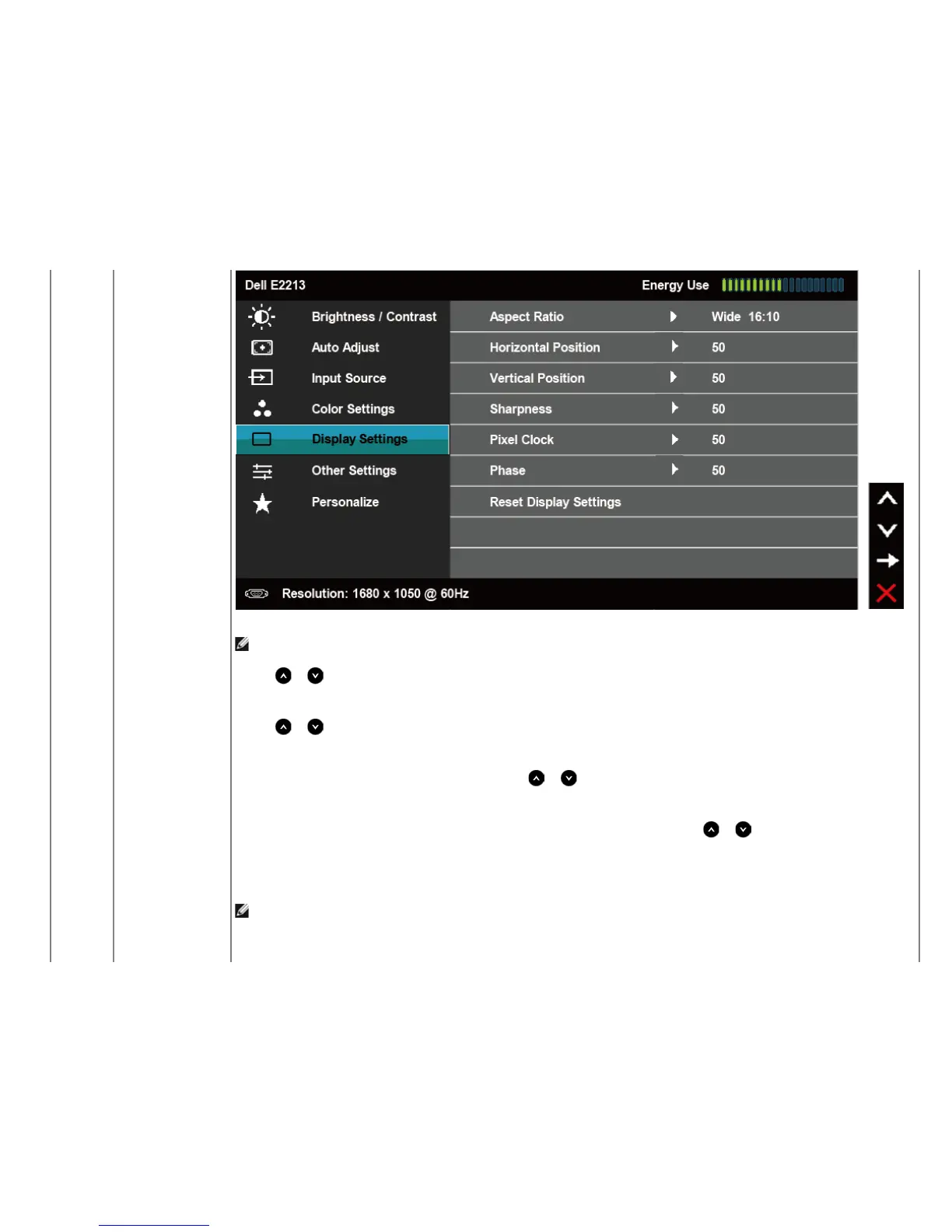 NOTE: Wide 16:10 adjustment is not required at maximum preset resolution 1440 x 900 (for E1913) or 1680 x 1050 (for E2213) .
