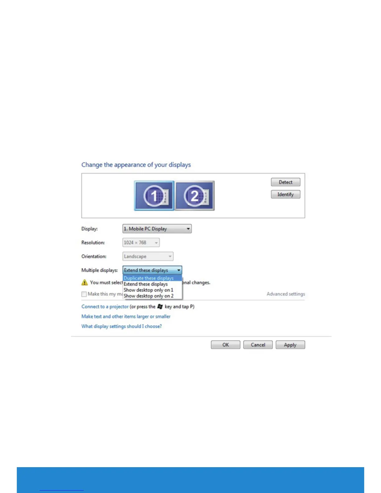 • Duplicate these displays: Duplicate the same screen on two monitors