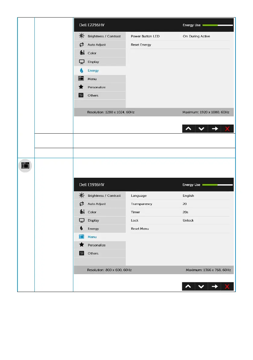 Dell E1916HV - Power Button LED Control; Reset Energy Settings; OSD Menu Configuration