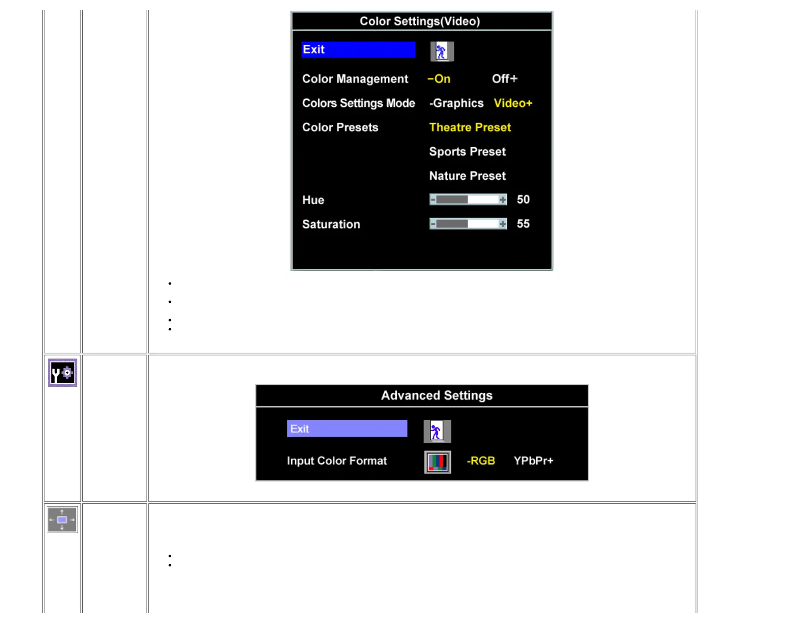 Choose the RGB option if monitor is connected to a PC or a DVD using a VGA or a DVI cable. Choose the YPbPr+ option if monitor is
