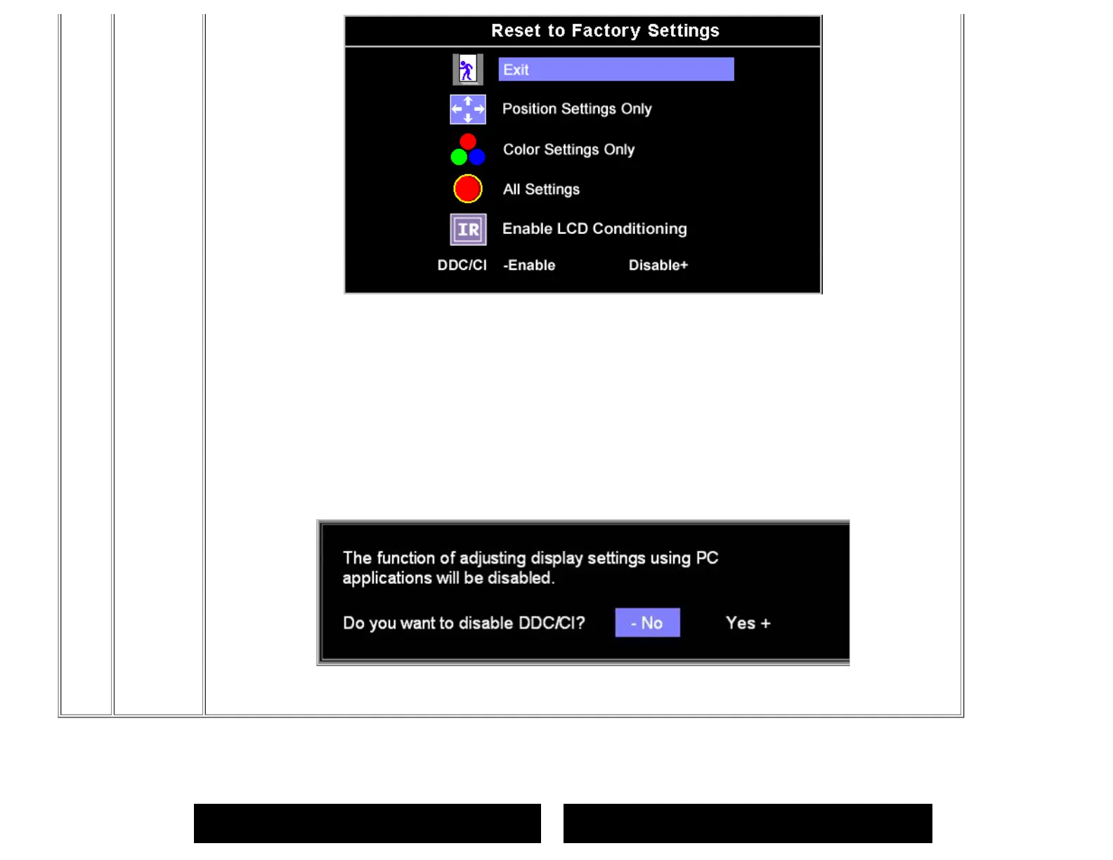 NOTE:If you select 'disable' for DDC/CI,a warning message as shown in the picture above appears on the screen.Then you can