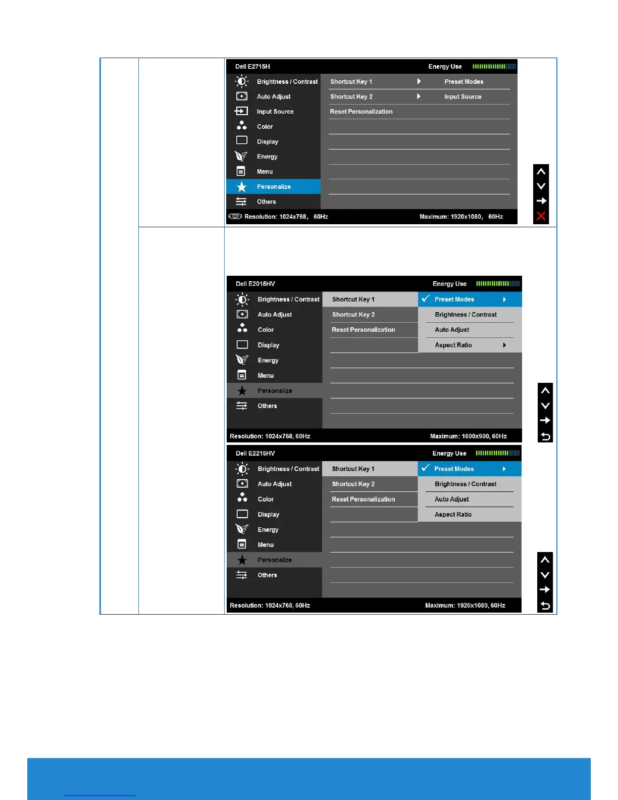 "Auto Adjust", "Input Source" for E2715H only, "Aspect
