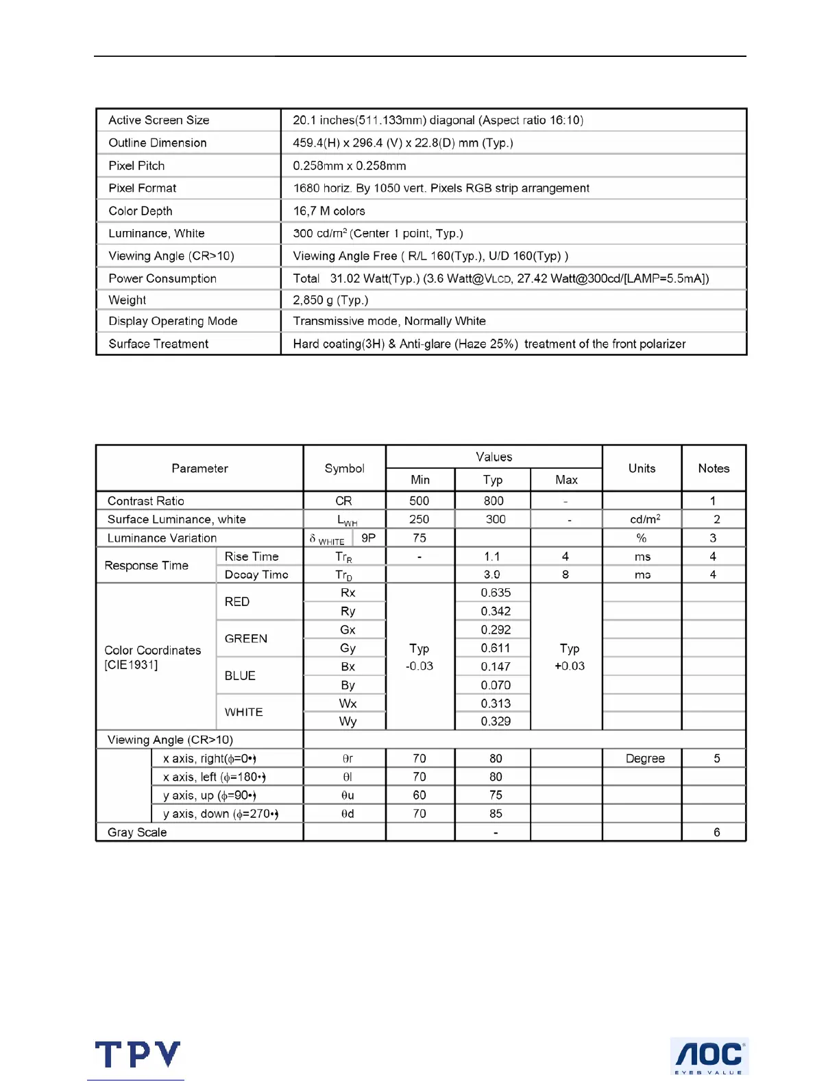 Measured conditions as follows: Ta=25 °C, VLCD=5.0V, fV=60Hz Dclk=119MHz, IBL=5.5mA