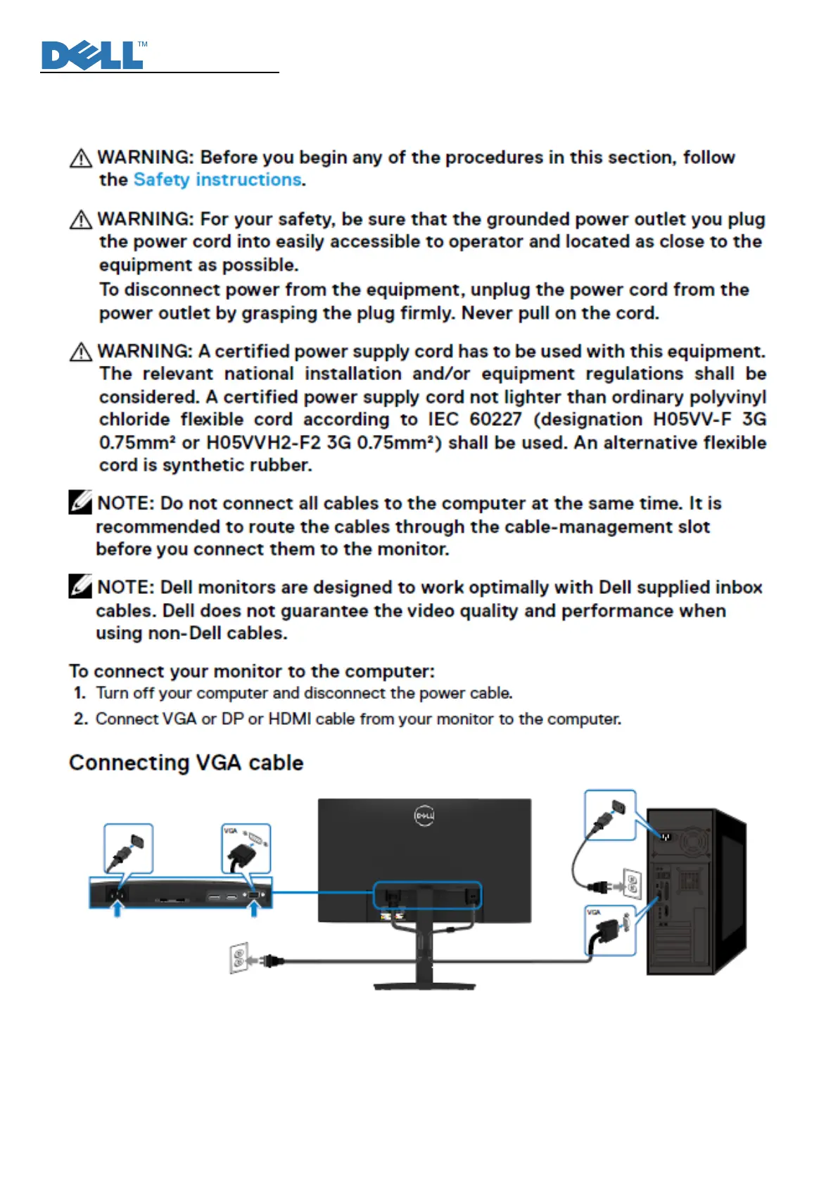 Dell E2422HN - Connecting and Disconnecting Cables; Connecting VGA Cable
