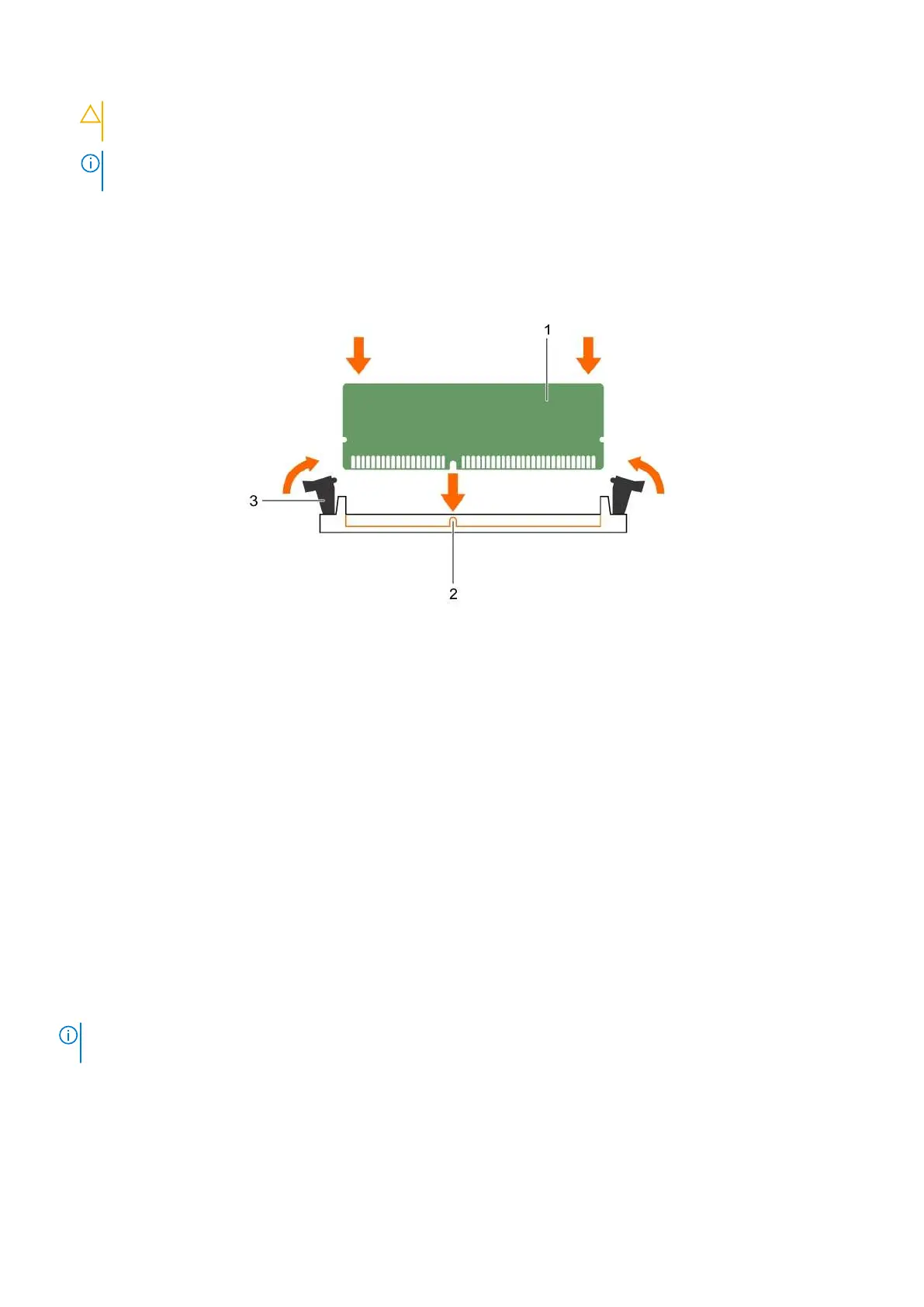 CAUTION: Do not apply pressure at the center of the memory module; apply pressure at both ends of the
