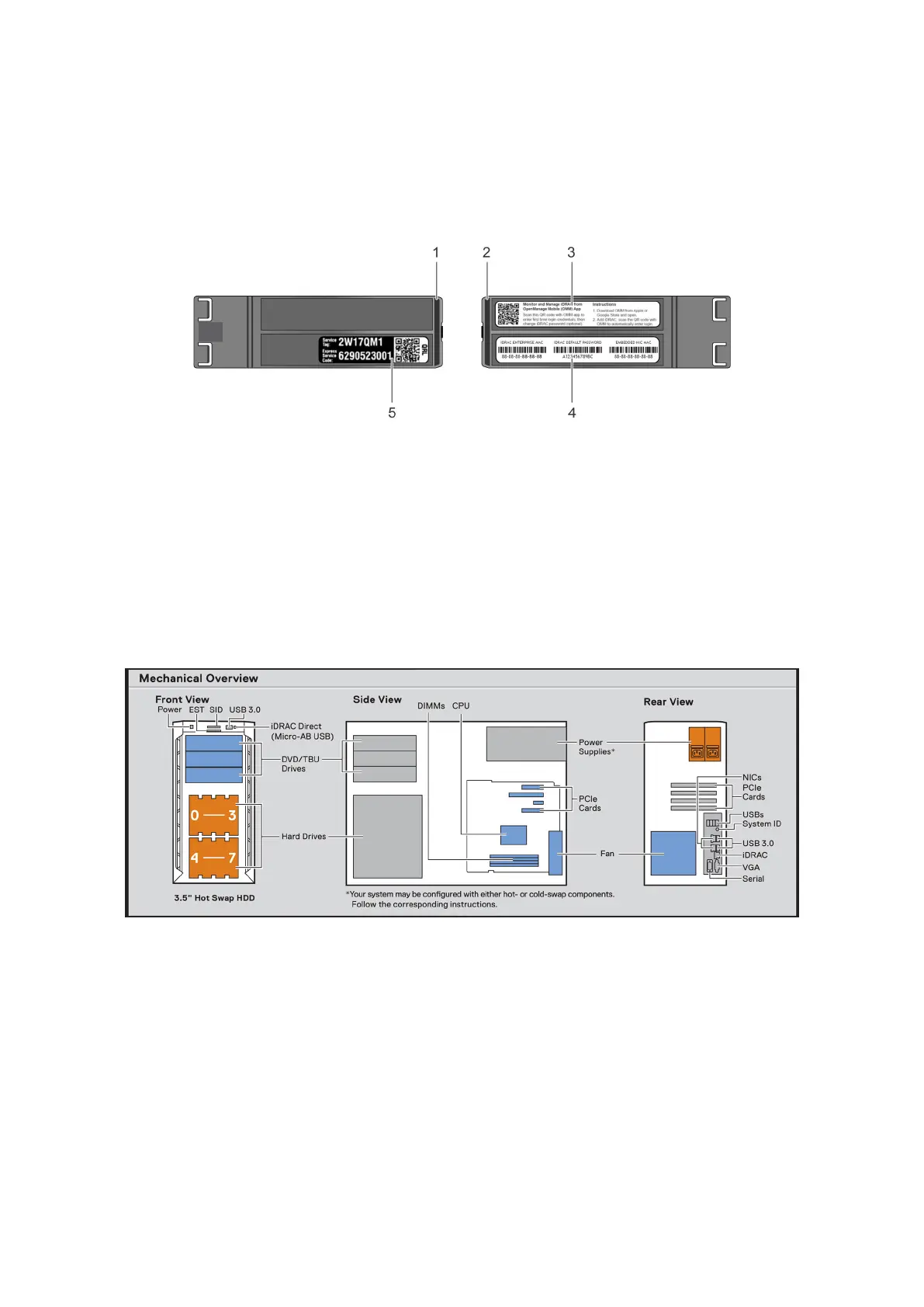 3. OpenManage Mobile (OMM) label 4. iDRAC MAC address and iDRAC secure password label
