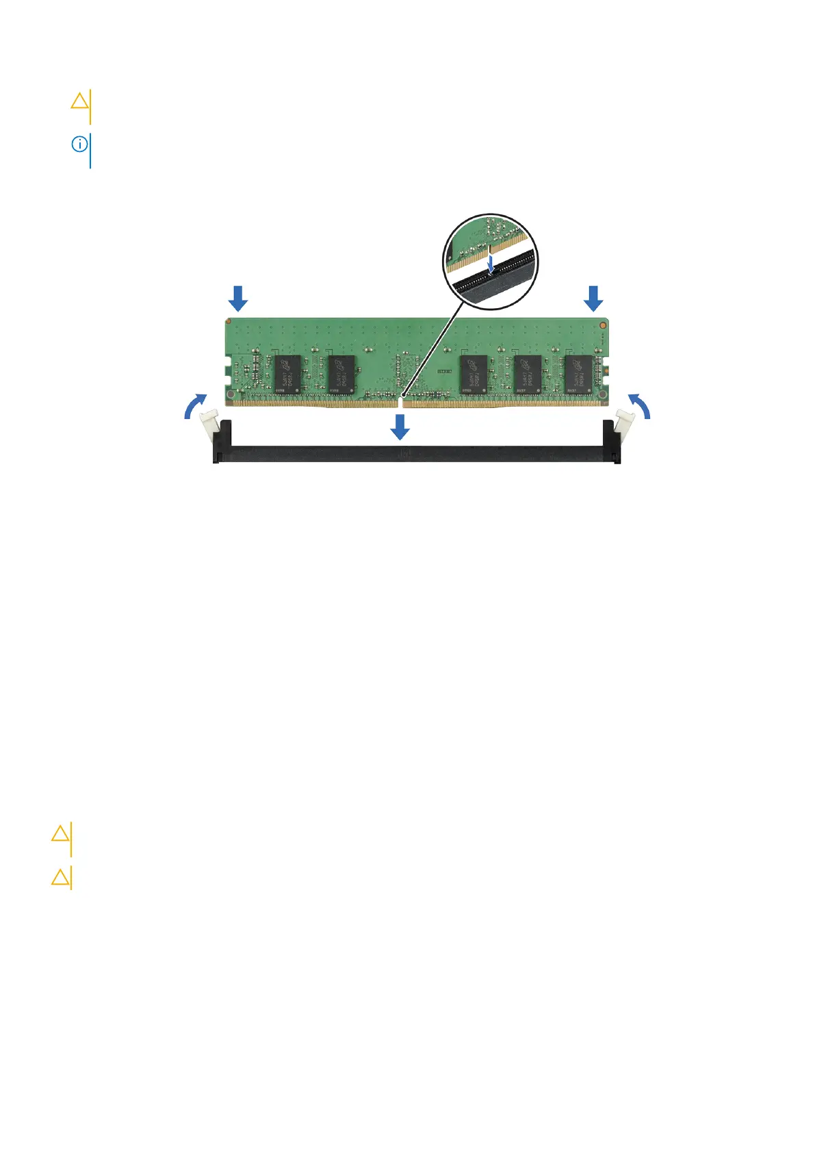 CAUTION: Do not apply pressure at the center of the memory module. Apply pressure at both ends of the