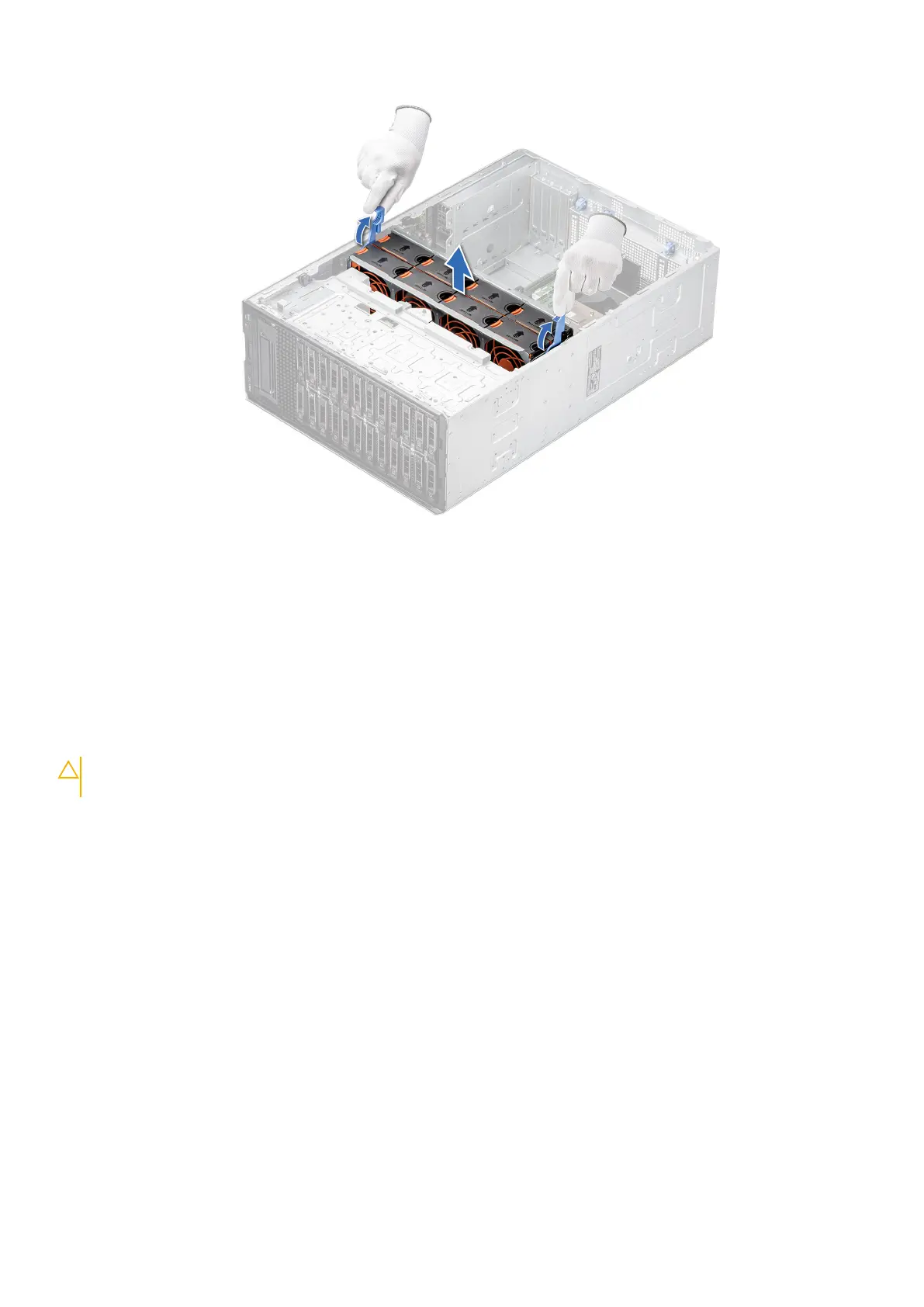1. Holding the blue release levers, align the guide rails on the cooling fan cage with the standoffs on the system.