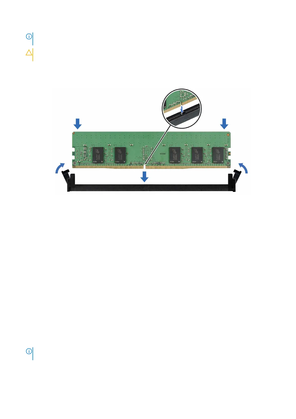 CAUTION: Do not apply pressure at the center of the memory module; apply pressure at both ends of the