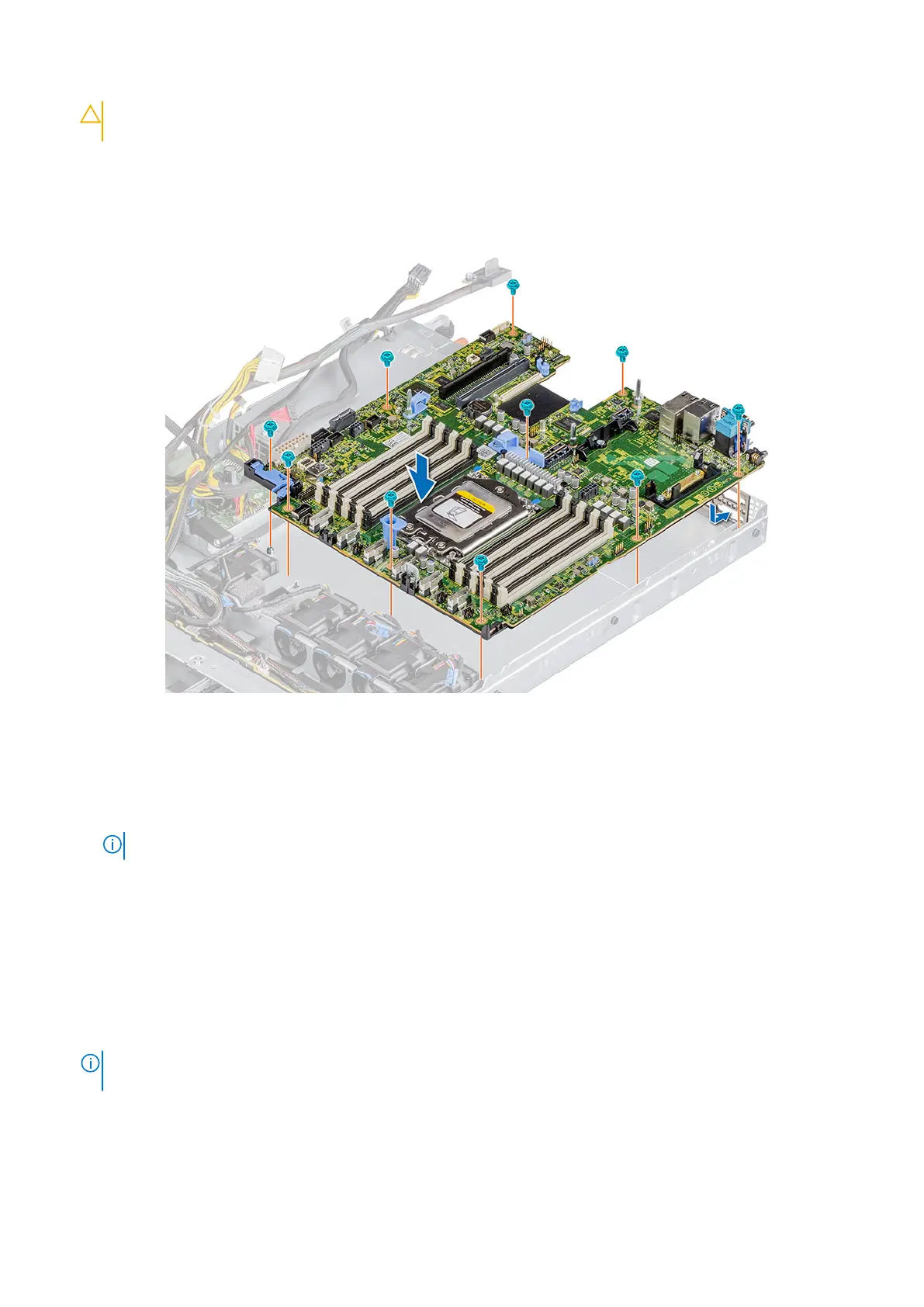 CAUTION: Take care not to damage the system identification button while placing the system board into the