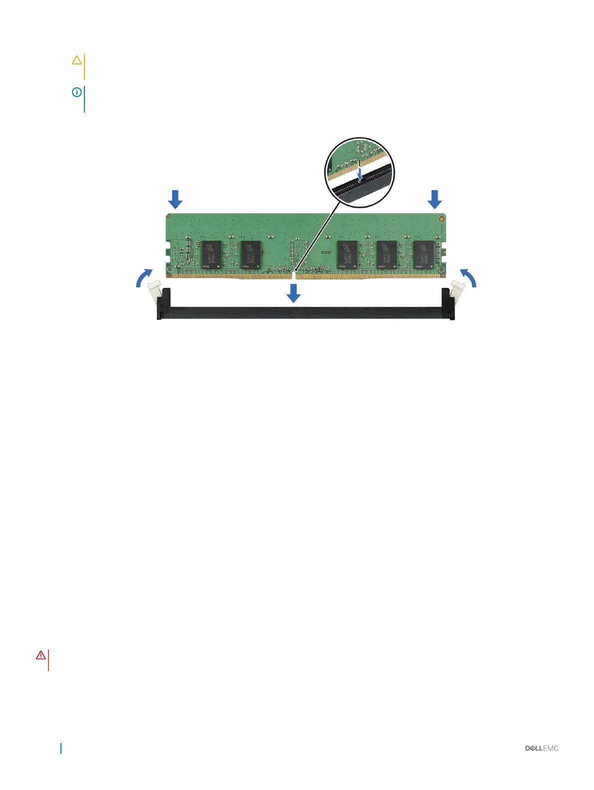 CAUTION: Do not apply pressure at the center of the memory module; apply pressure at both ends of the memory
