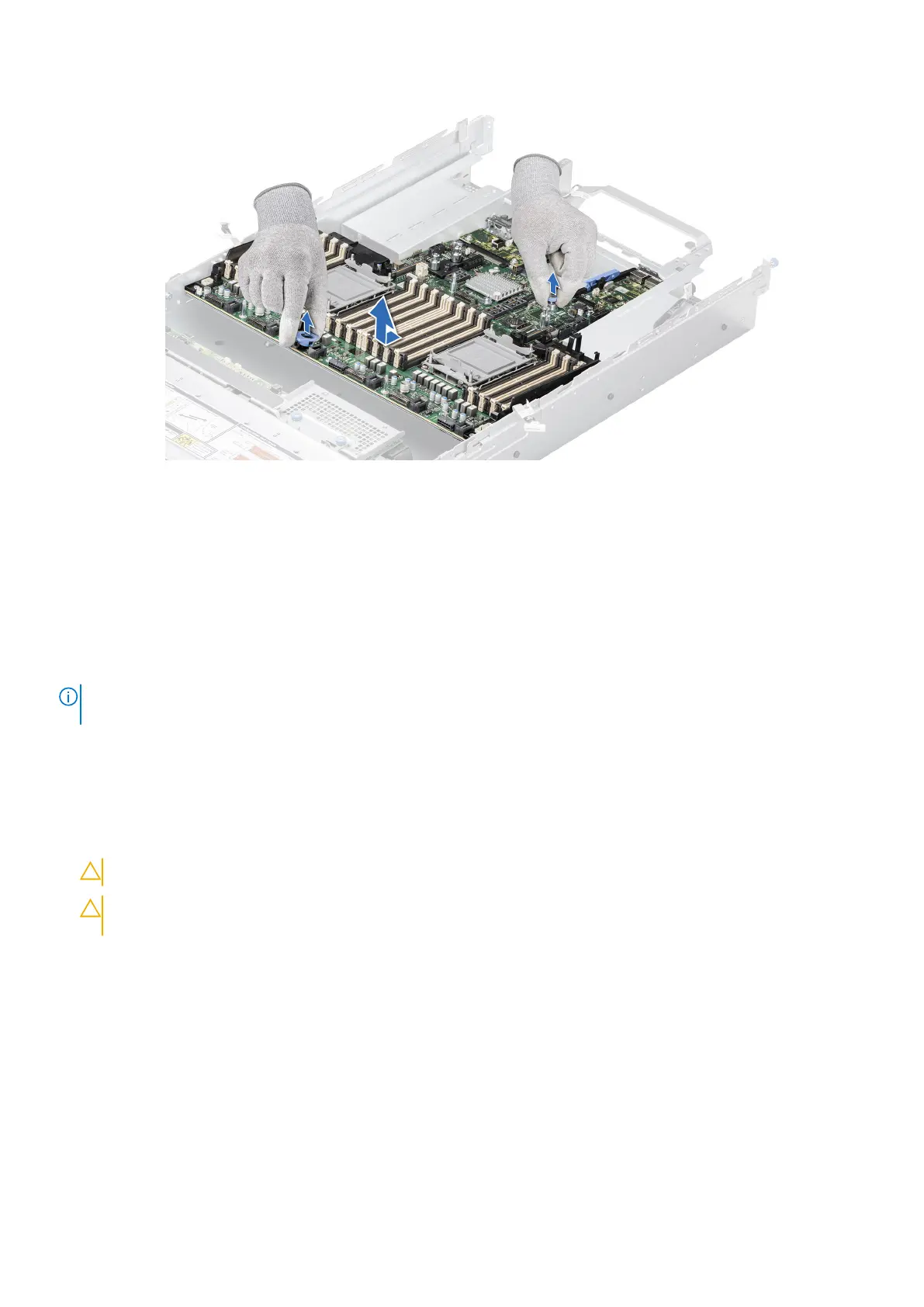 CAUTION: Do not lift the system board by holding a memory module, processor, or other components.
