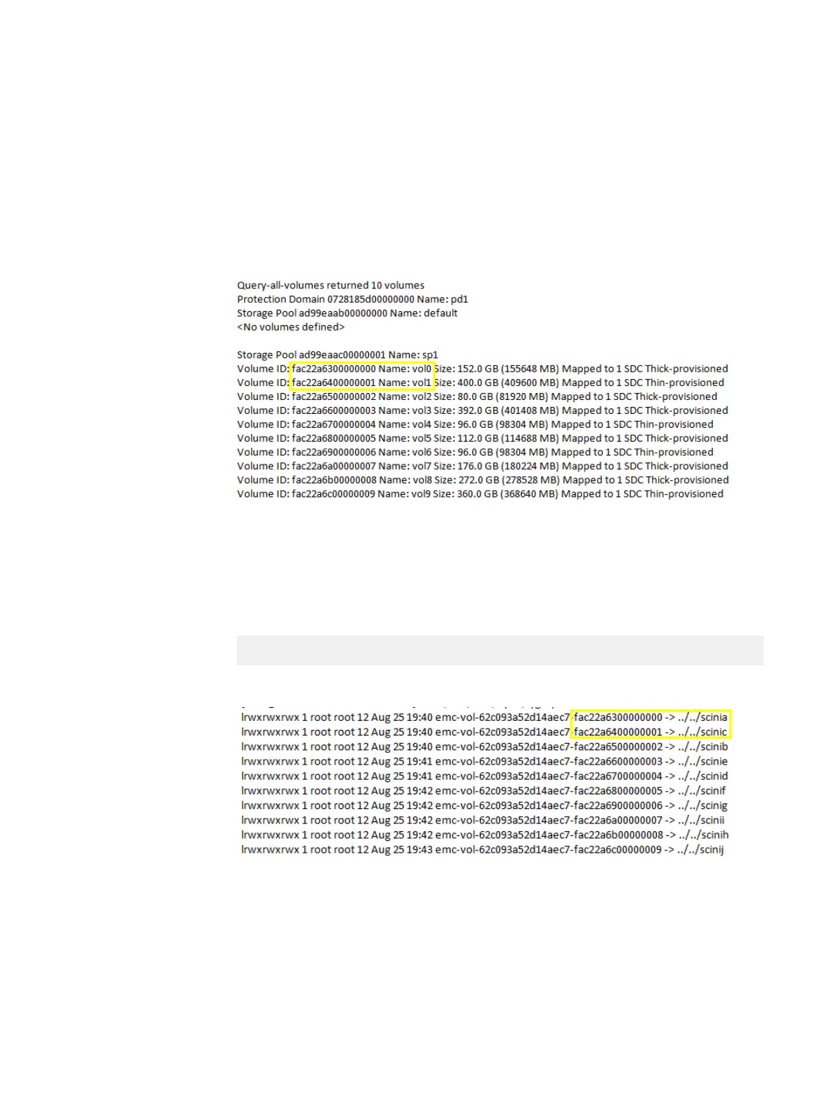 This output shows the scini volume name and the volume ID.