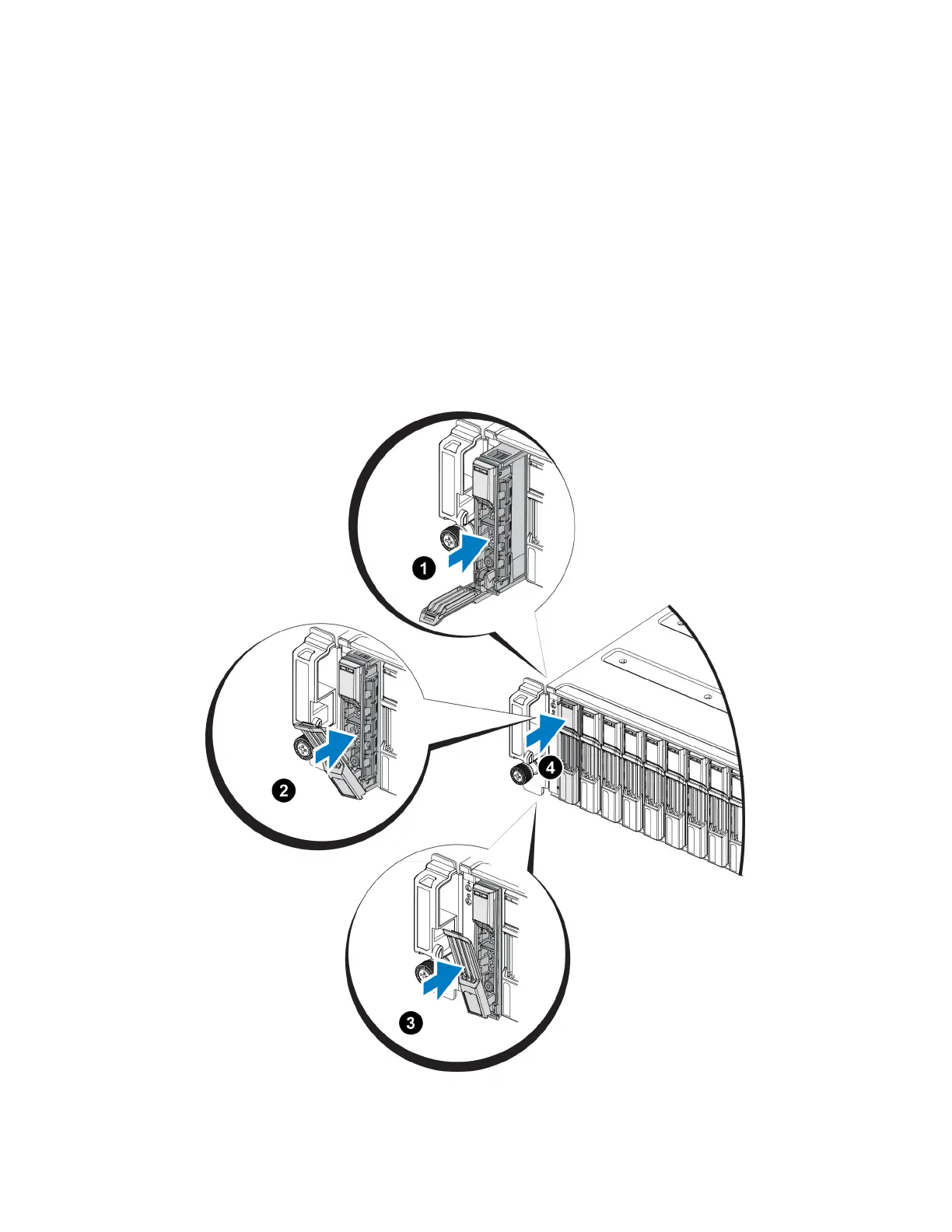 4. Push the drive completely into the slot (callout 2). The drive handle will begin to close onto the drive (callout