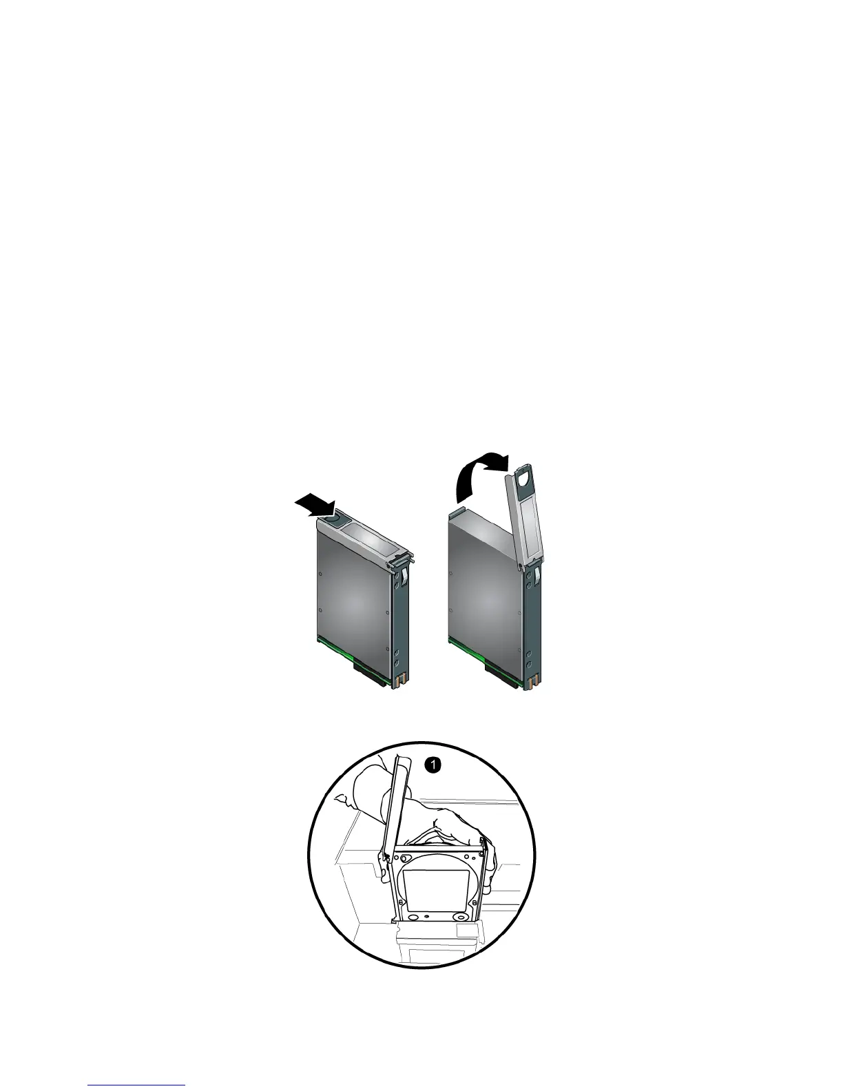 the rear of the array (where the power supplies and control modules are). Start to insert the drive (1).