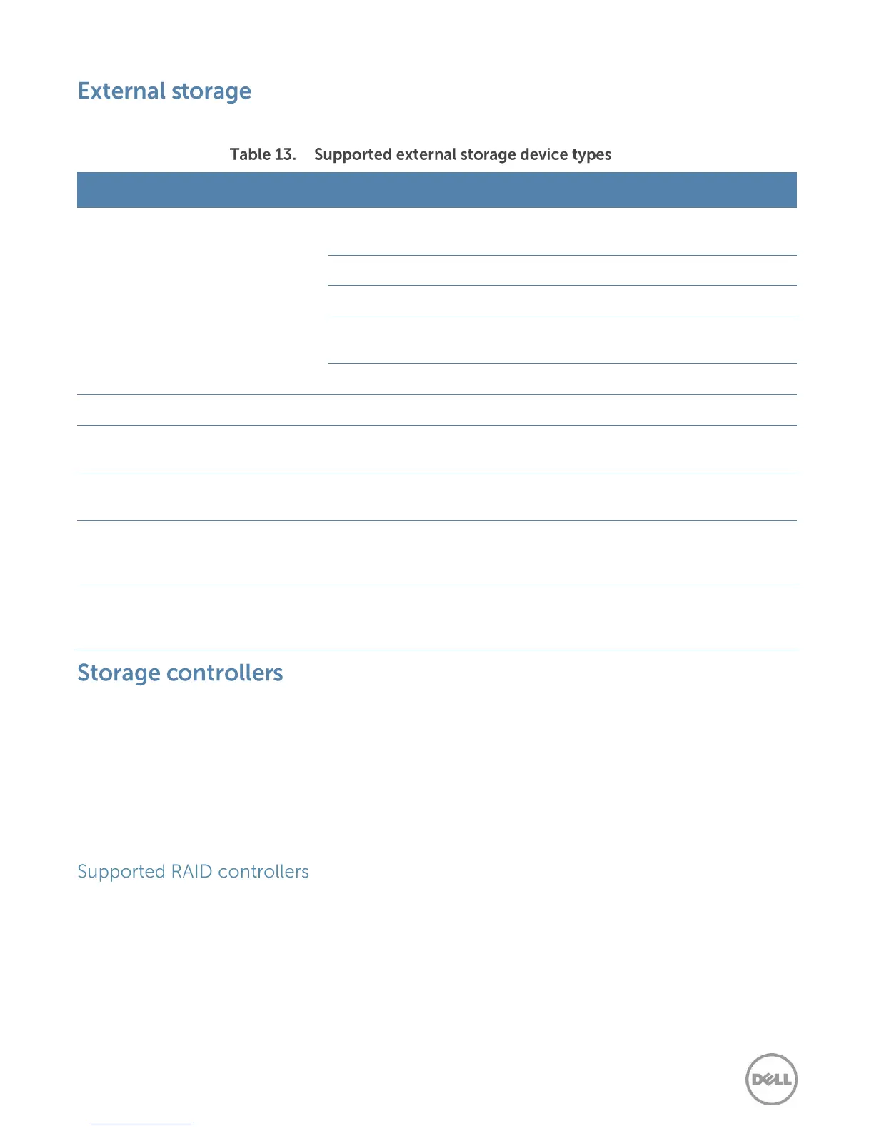 Table 13 lists the types of external storage devices supported by the R720 and R720xd.