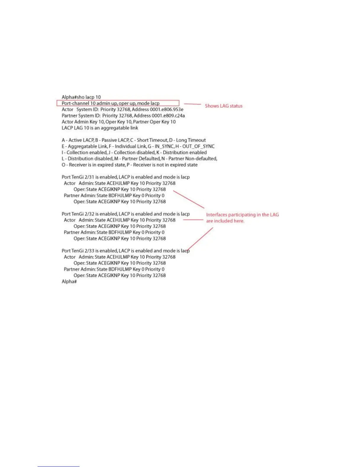 To Verify LAG 10 Status on ALPHA, use the show lacp command (Figure 16-13).