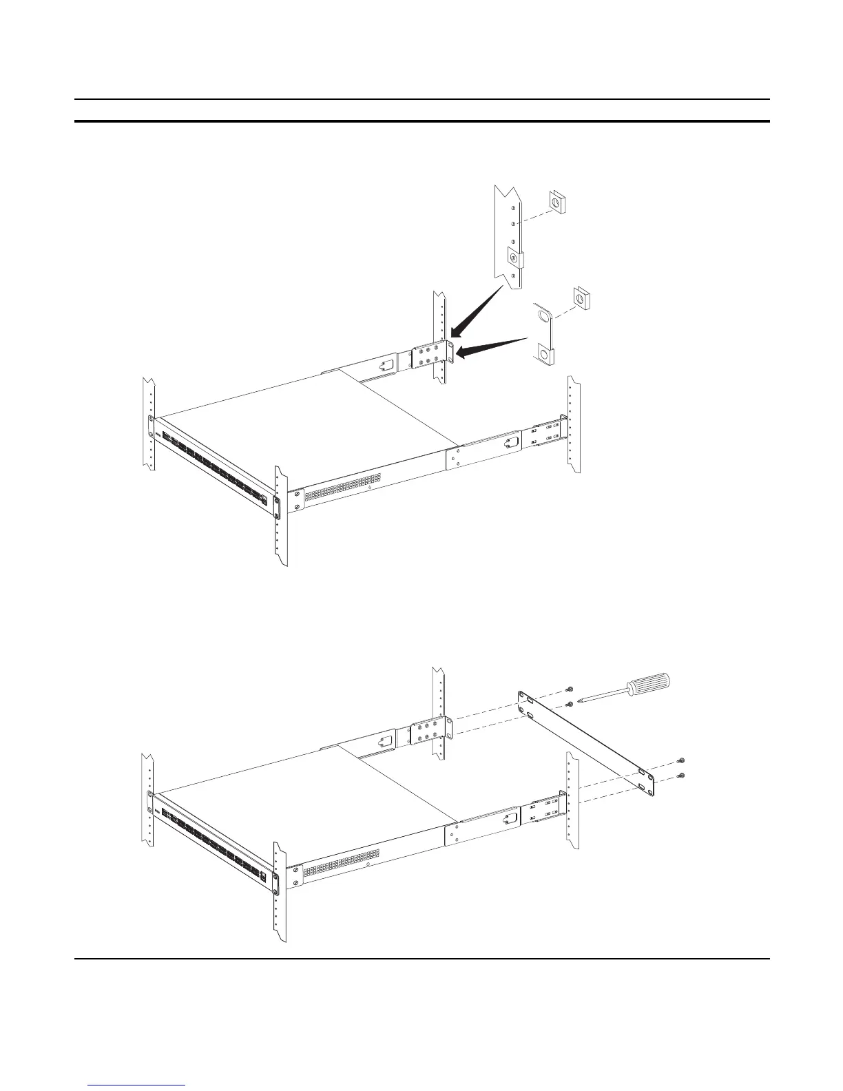 5 Align the rack filler panel to the rear bracket and rack posts. Secure by inserting two screws into the hole in the