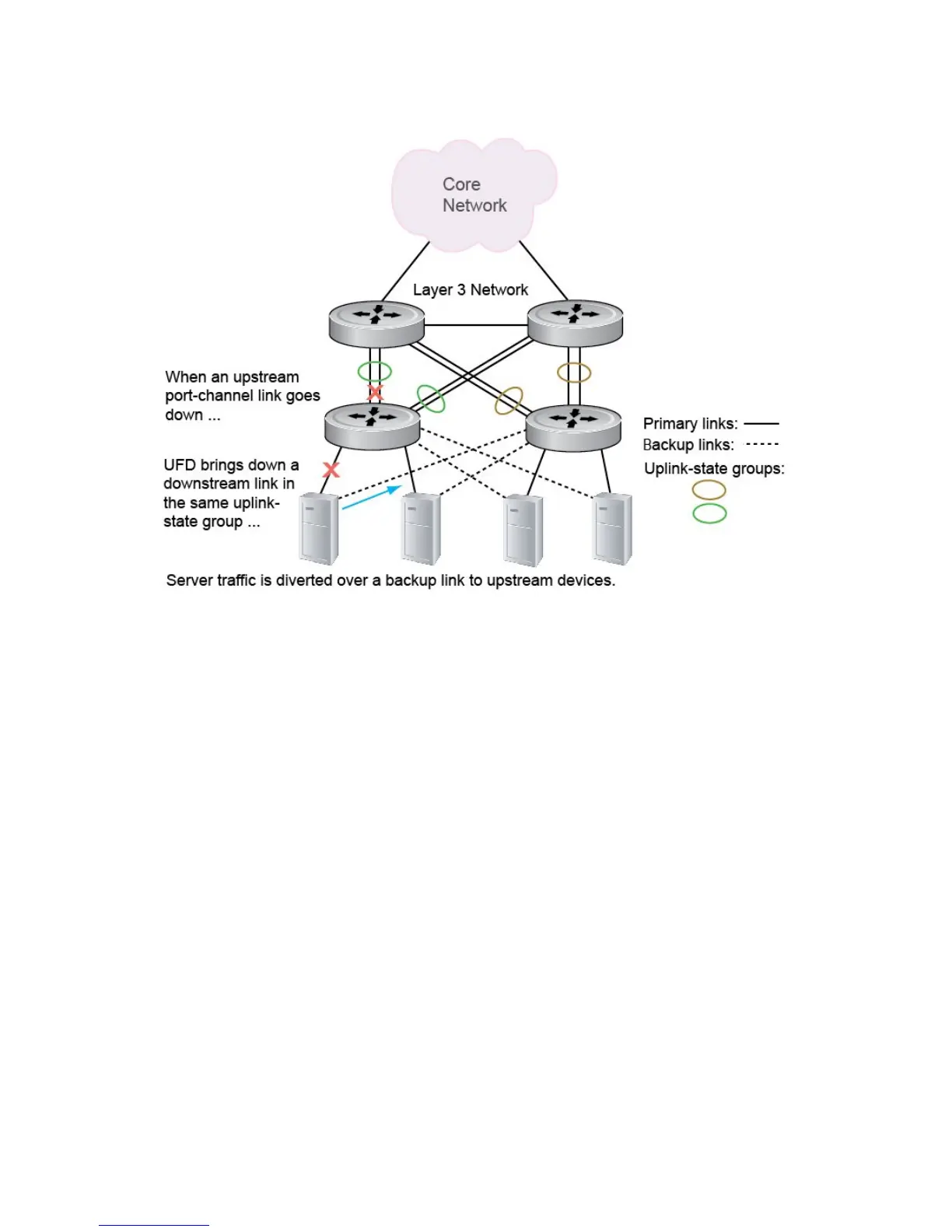 An enabled uplink-state group tracks the state of all assigned upstream interfaces. Failure on an upstream