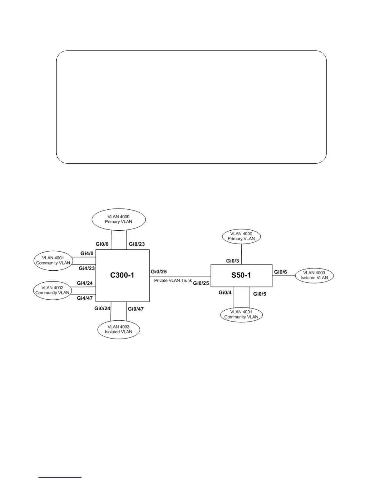 • Gi 0/25 is configured as a PVLAN trunk port, also assigned to the primary VLAN 4000.