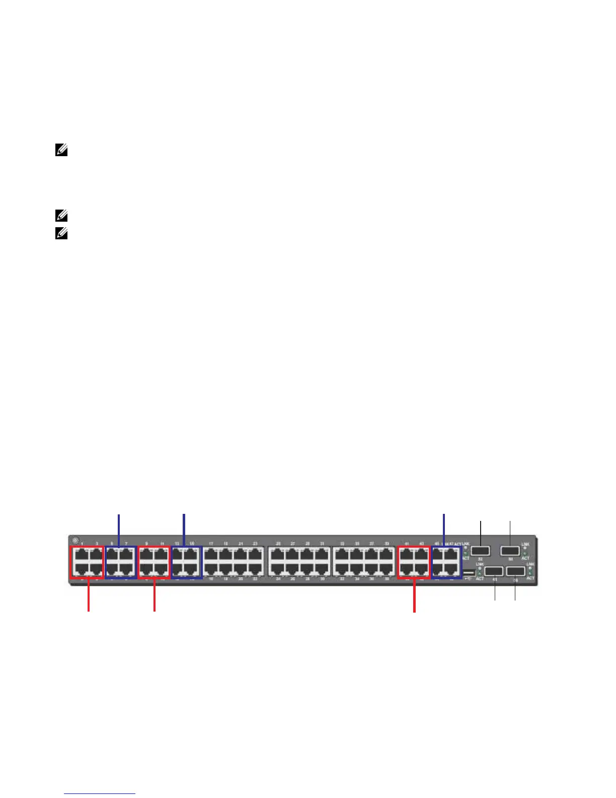 • Data ports are configured as stacking ports in predefined stacking groups of 40G (four 10G ports or one