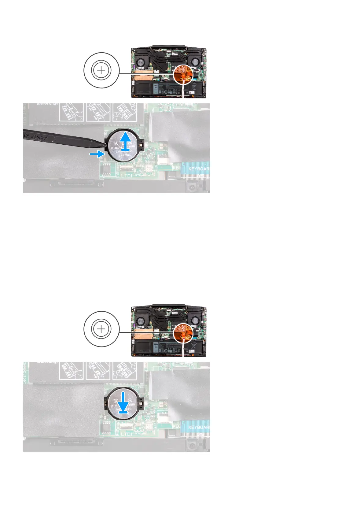 Using a plastic scribe, pry the coin-cell battery out of the coin-cell battery slot on the system board.