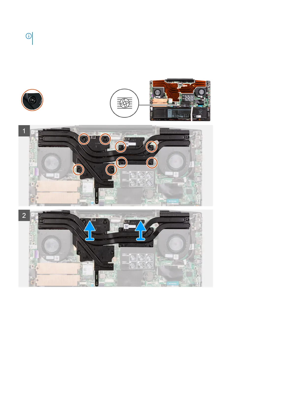 1. In the sequential order (1>2>3>4>5>6>7>8), loosen the eight captive screws that secure the heat sink to the system board.