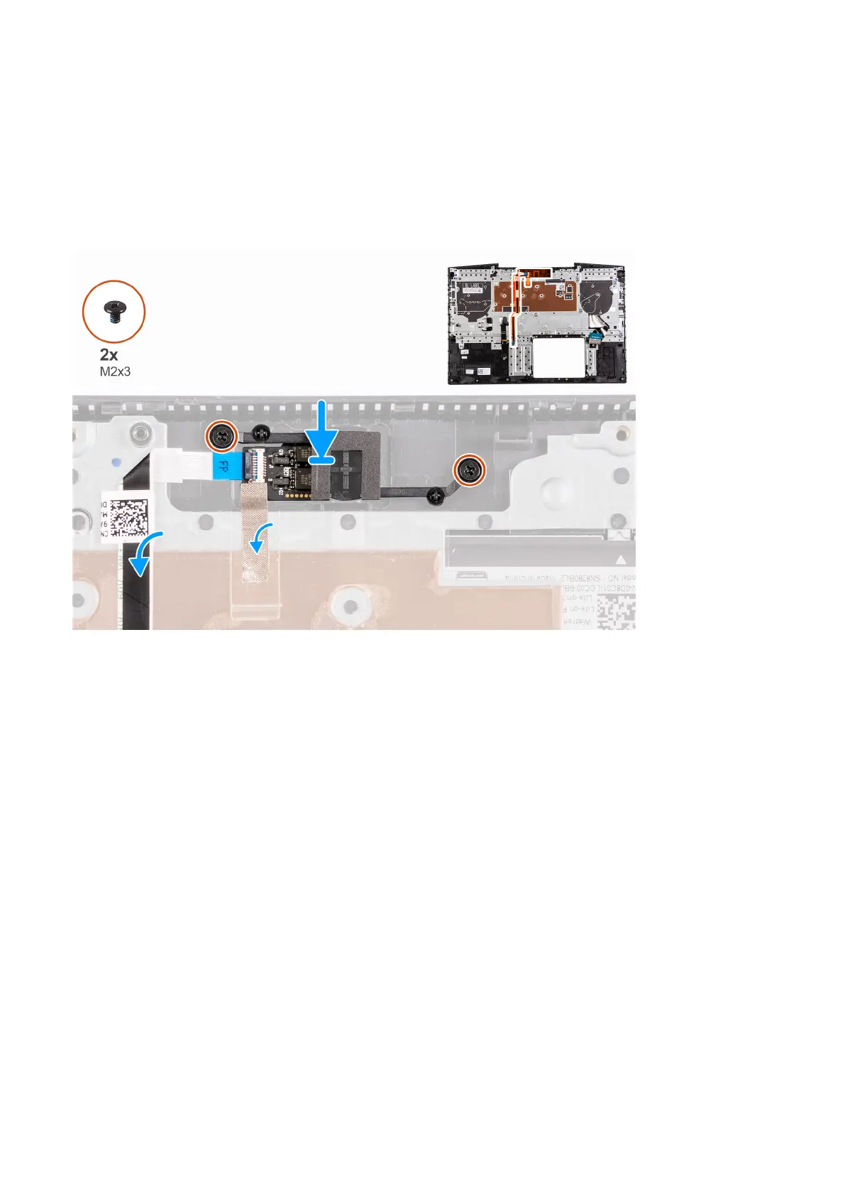 3. Replace the two screws (M2x3) that secure the power button with fingerprint reader to the palm-rest and keyboard assembly.