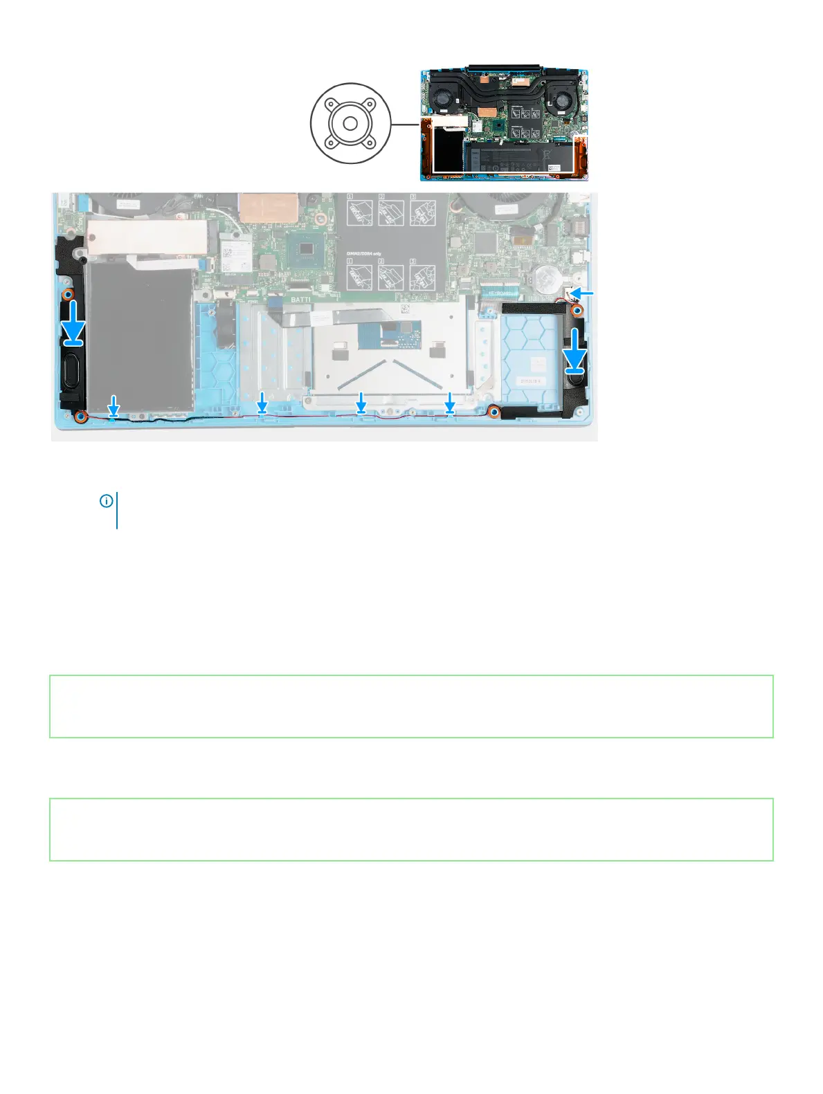 1 Using the alignment posts and rubber grommets, place the speakers in the slots on the palm-rest and keyboard assembly