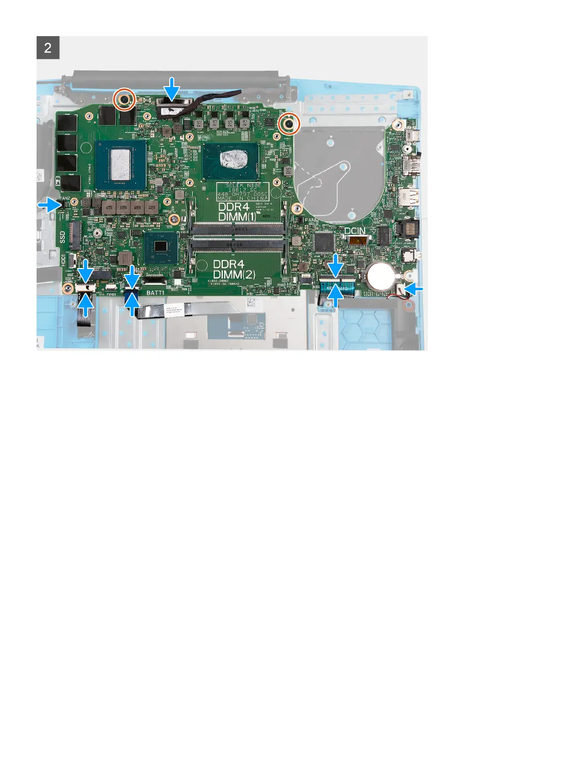 8 Replace the two (M2x2) screws that secure the system board to the palm-rest and keyboard assembly.