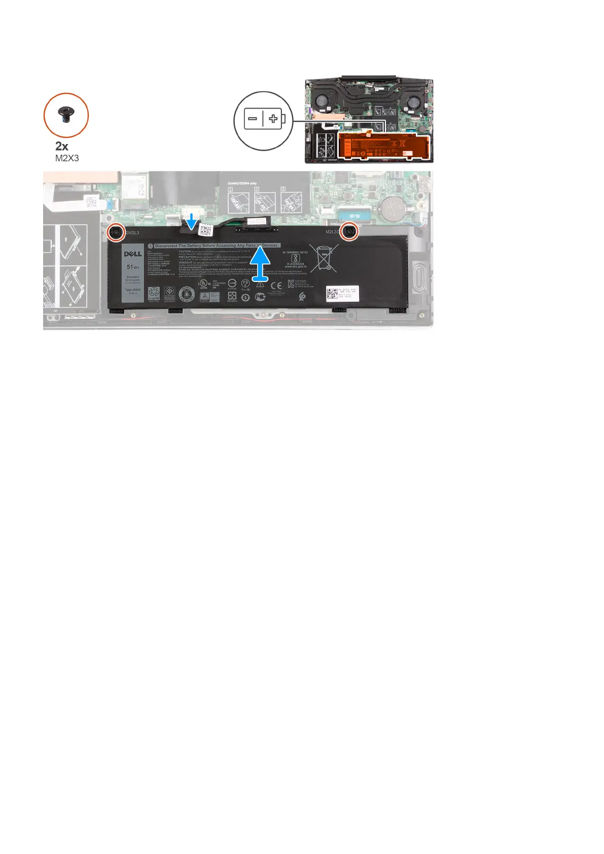 1. Remove the two screws (M2x3) that secure the battery to the palm-rest and keyboard assembly.