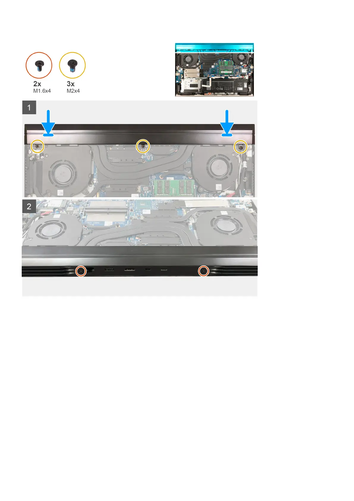 3. Replace the two screws (M1.6x4) that secure the rear cover to the palm-rest and keyboard assembly.