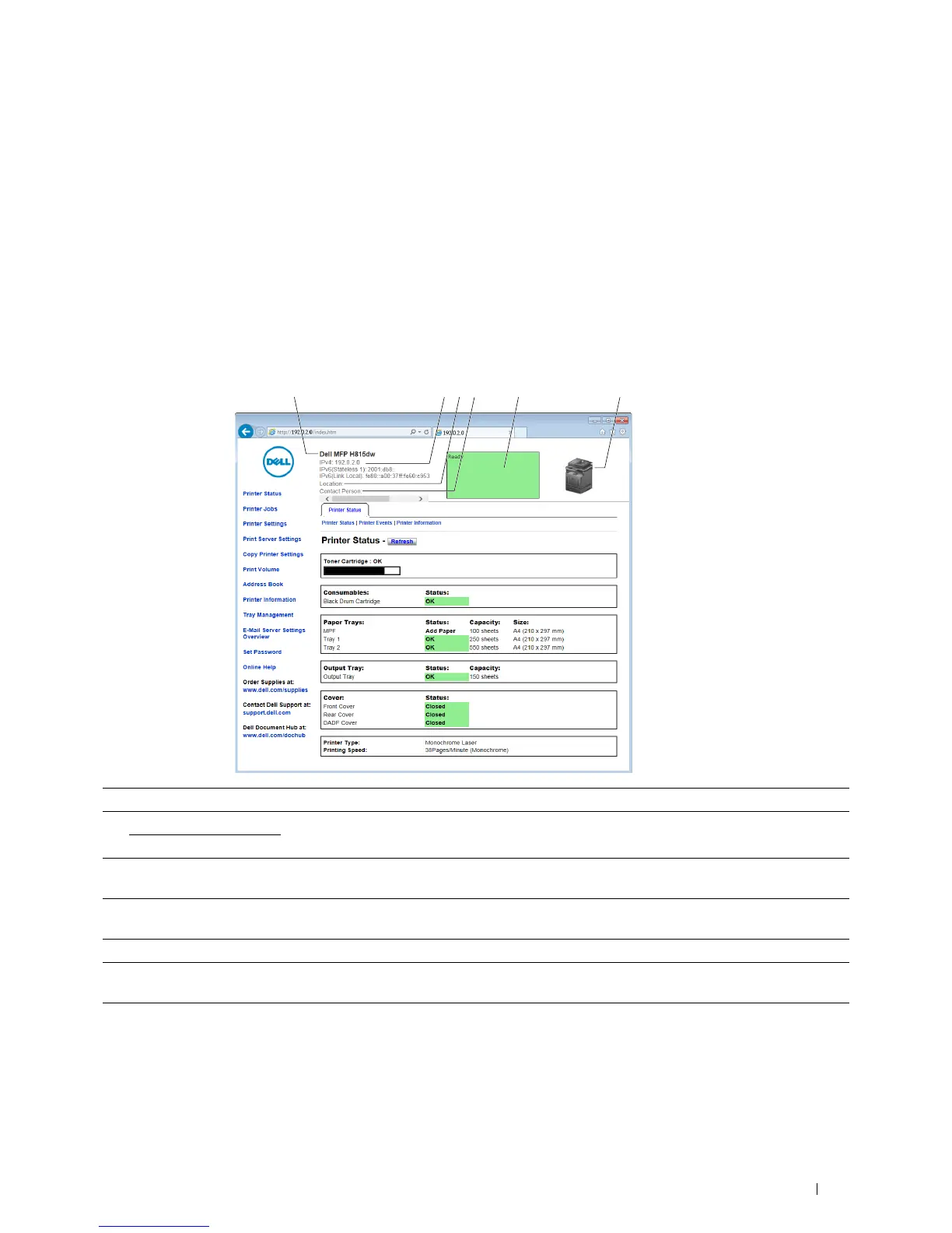 The top frame is located at the top of all pages. When the Dell Printer Configuration Web Tool is activated, the