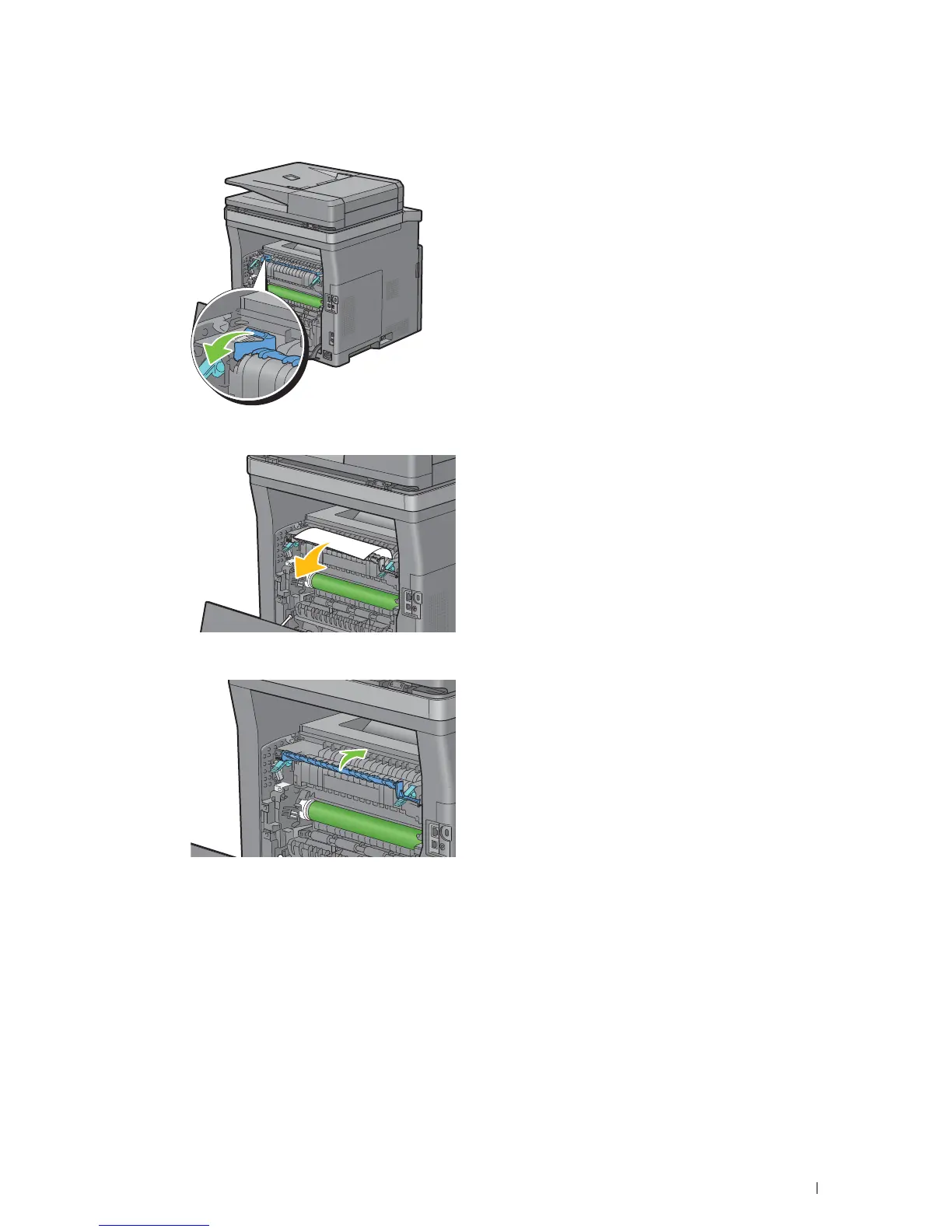 If the document is jammed above the fusing unit, raise the tab of the inner part, and turn it to open.