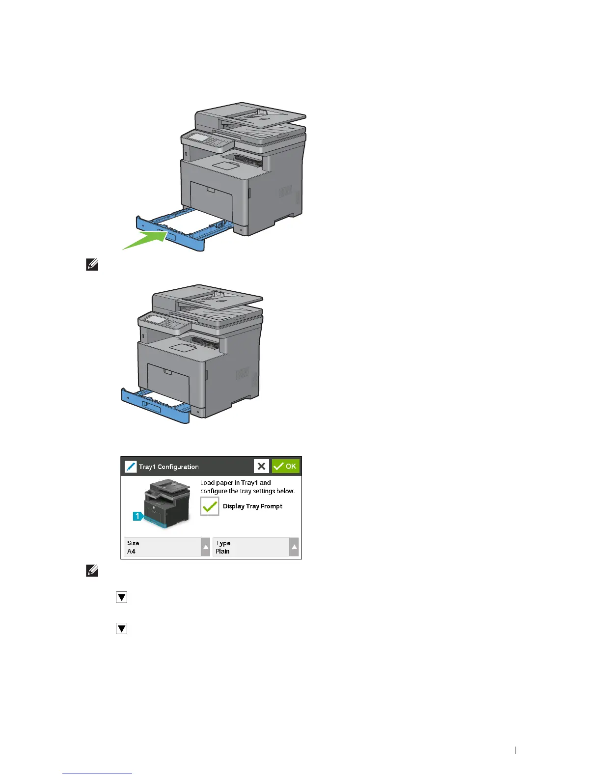 After confirming that the guides are securely adjusted, insert the tray into the printer.