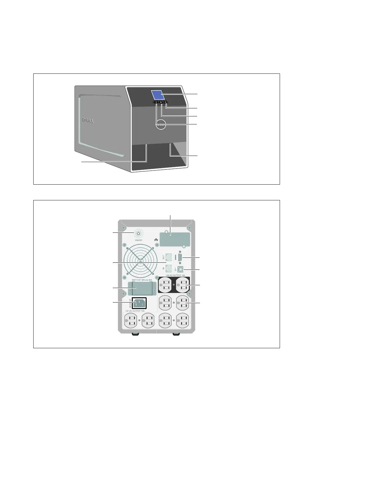 This section shows a front and rear panel of the Dell Tower UPS. Refer to the Dell Line-Interactive