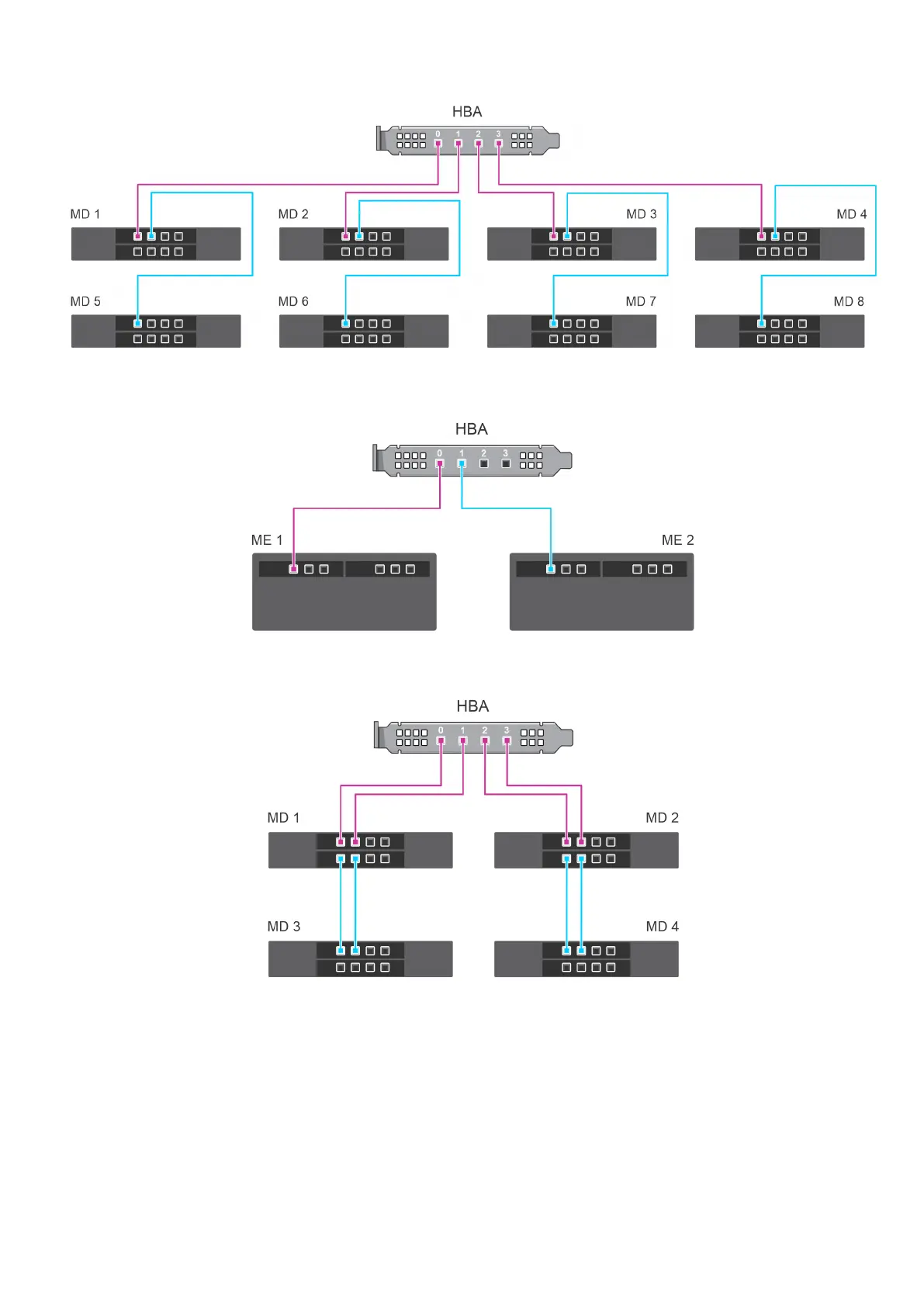Figure 14. Multipath configuration: Cabling HBA355e Adapter with MD1420 and MD1400 enclosures
