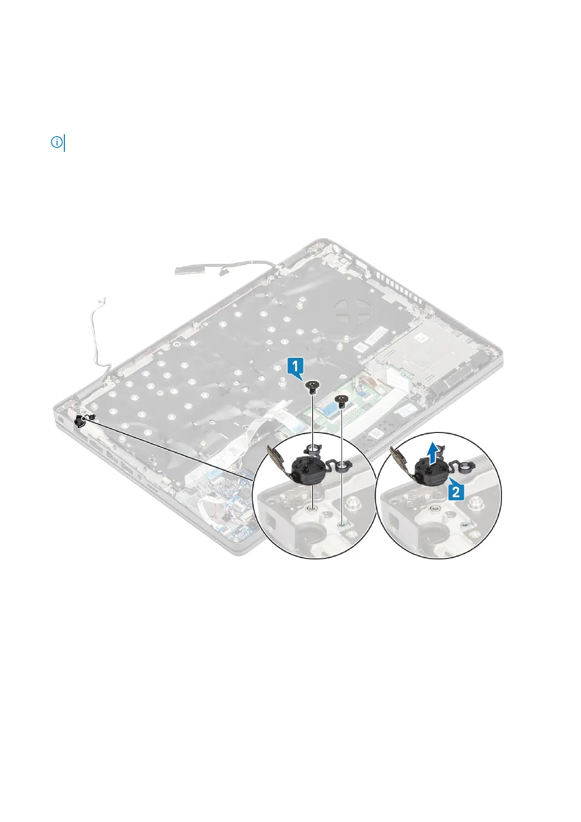1. Remove the two (M2x3) screws that secure the power button with fingerprint reader on the palmrest [1].